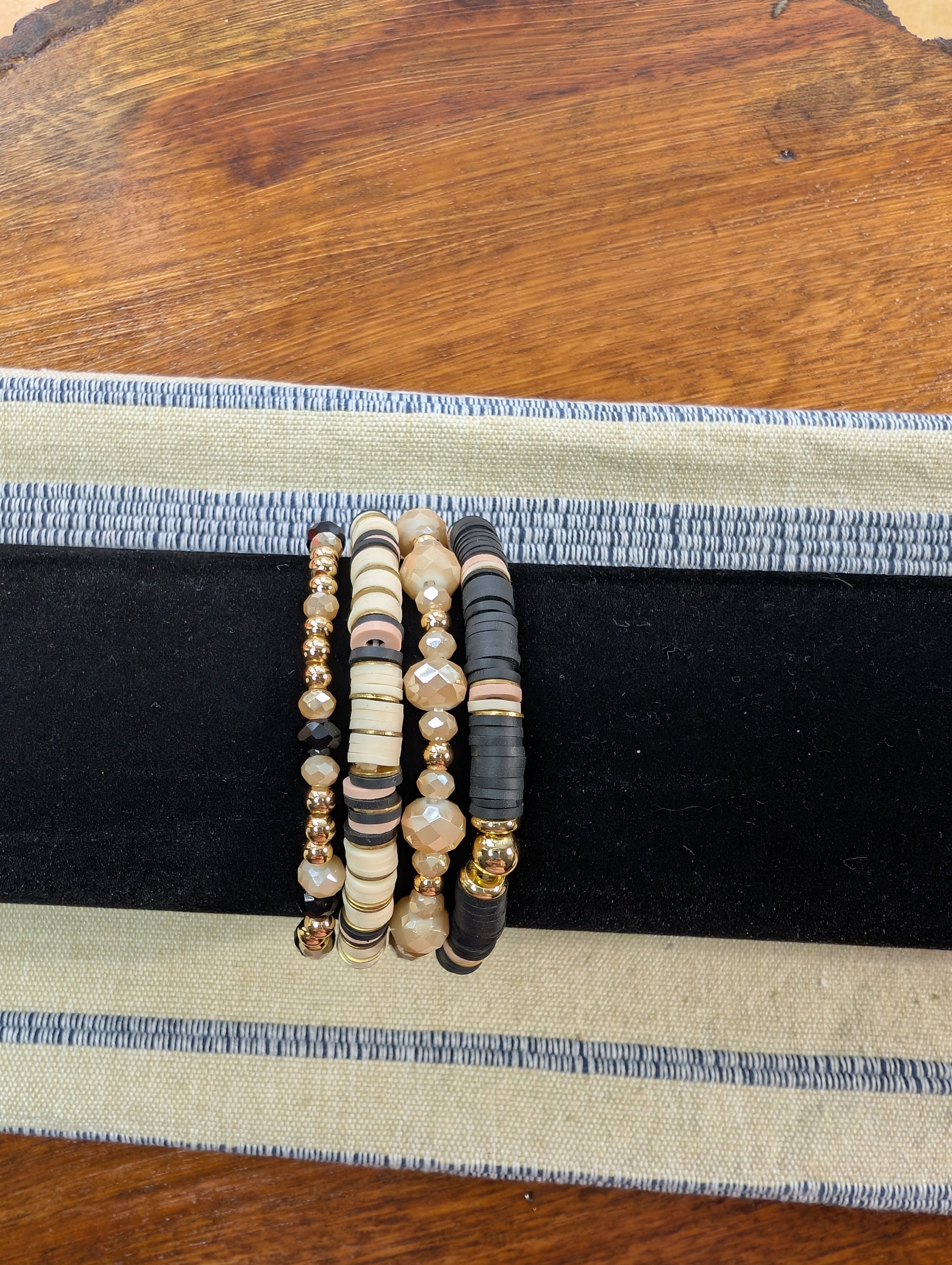 Stretch to fit size 7. Clay, glass, and 14k gold Plated beads.