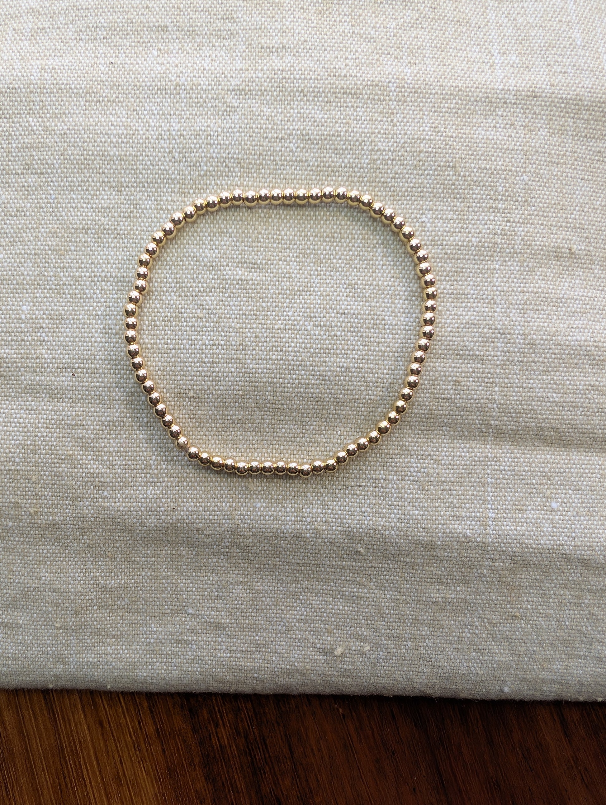 This dainty 3mm, 14k plated bead stretch bracelet set at 6.5 inches. Plate will tarnish over time. Limiting exposure to moisture will extend the life of the plated beads.