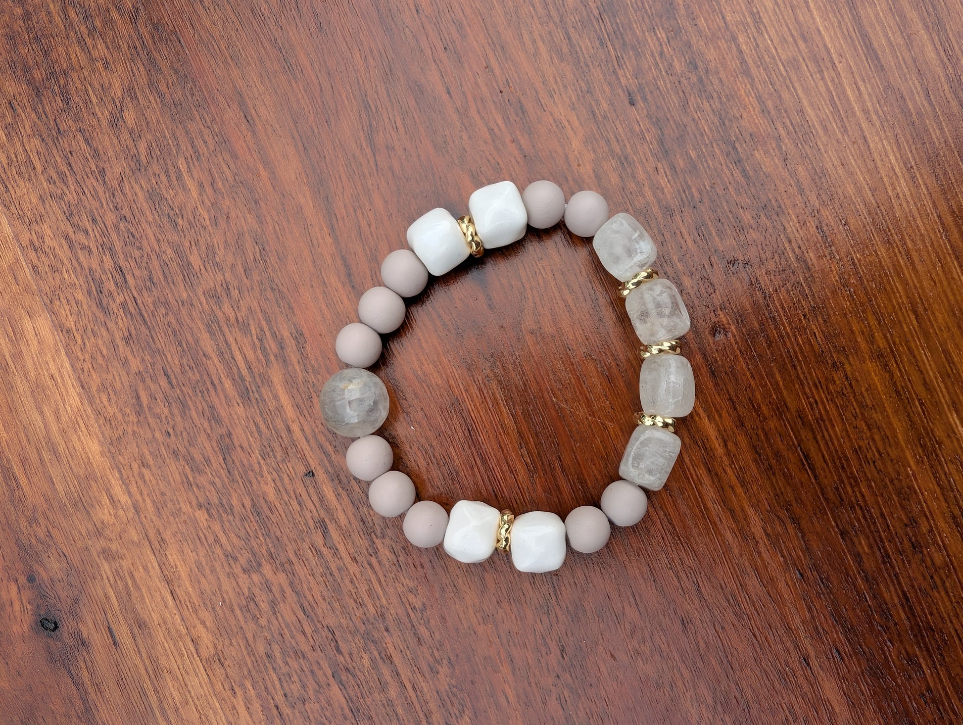 Stretch bracelet to fit 6.5 inch wrist. 8mm-12mm glass, natural stone, and 14k gold plated beads